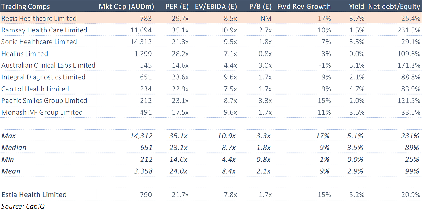 Regis is the only true peer out of this peer basket - peers taken from the IE report, which are the same as those from the IE report for Japara Healthcare (JHC AU).
