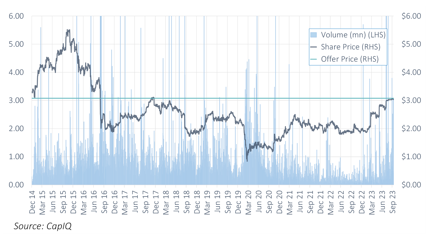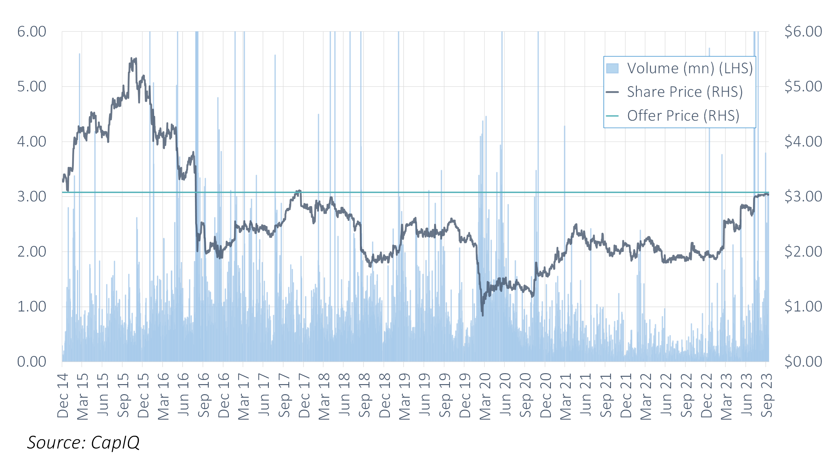 Premium. A$3.20 was a 50% premium to the undisturbed price of A$2.14/share on the 21 March.
