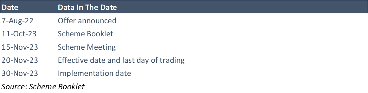 The Scheme Booklet is now out. A shareholder meeting will be held on the 15th of November with implementation expected on the 30th of November.