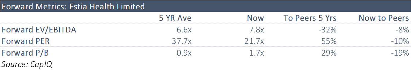 Estia's current forward EV/EBITDA of 7.8x compares to its five-year average of 6.6x.