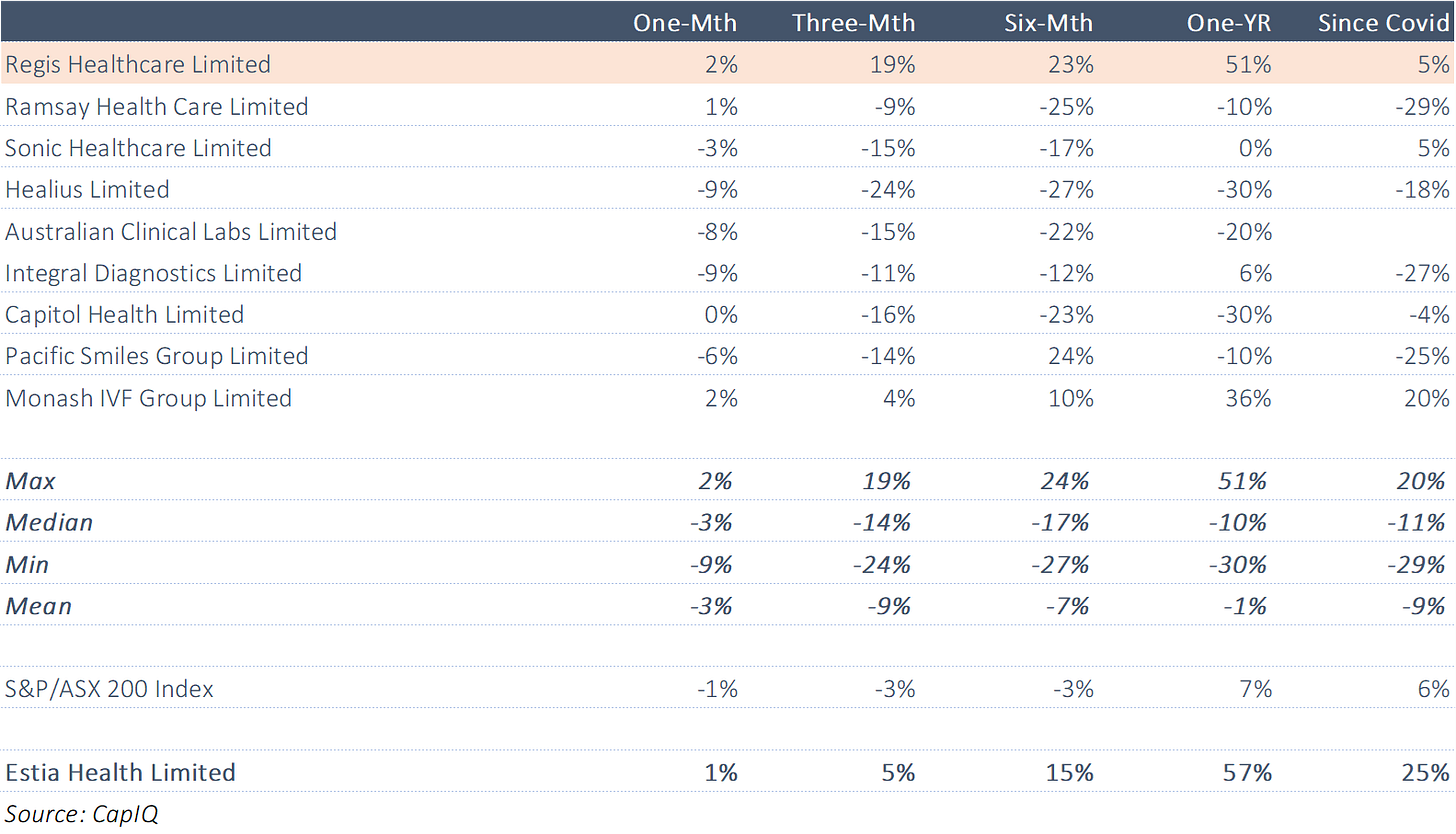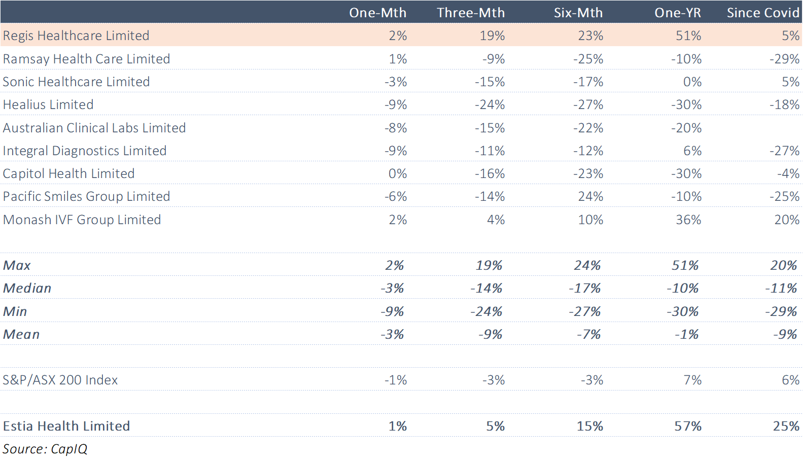 Following the initial Offer, Estia is up versus peers (and Regis) on a 12-month basis, and since Covid.