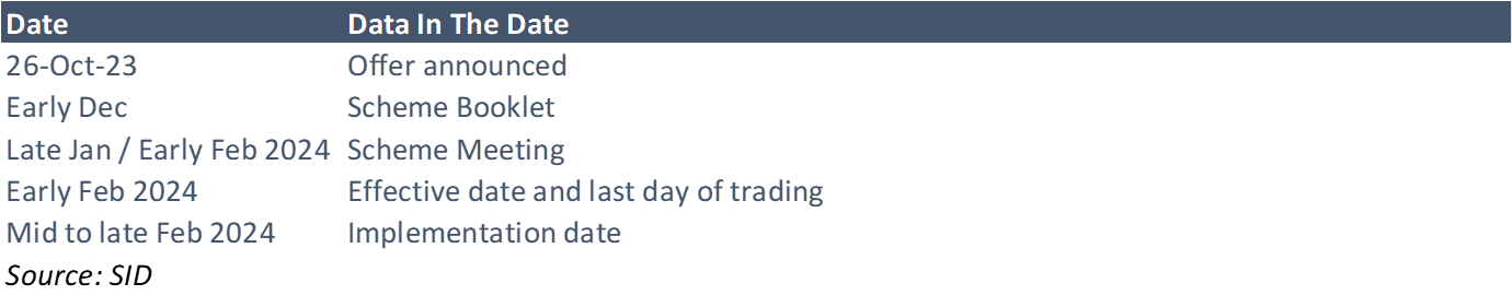 Timing. According to the announcement, the Scheme Meeting is expected to be held late January 2024, early February, with an implementation date mid-late February.