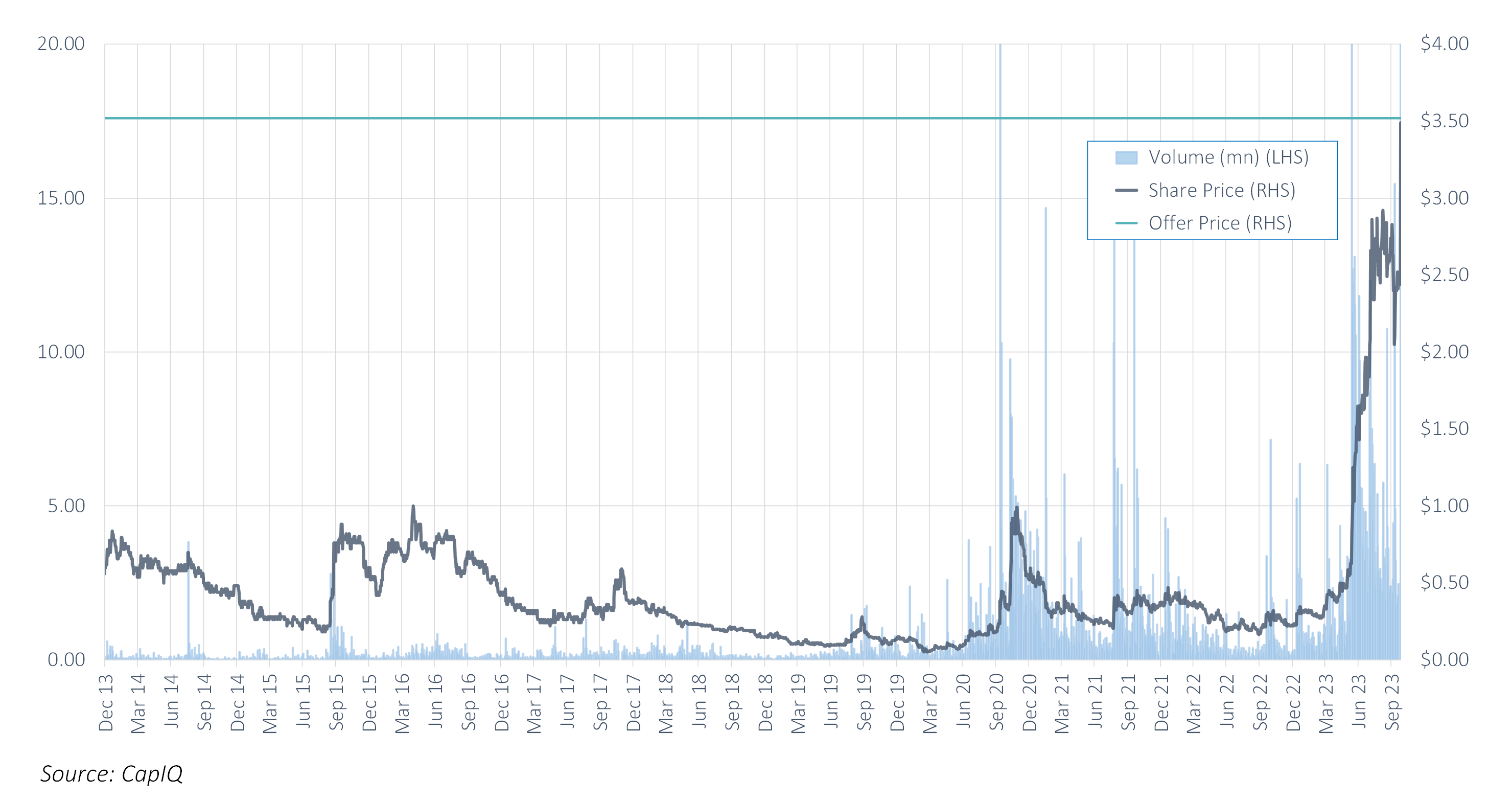 This was confirmed this morning with a A$3.52/share Offer, a 44.3% premium to undisturbed, by way of a Scheme. A concurrent conditional off-market takeover at A$3.50/share is also present.