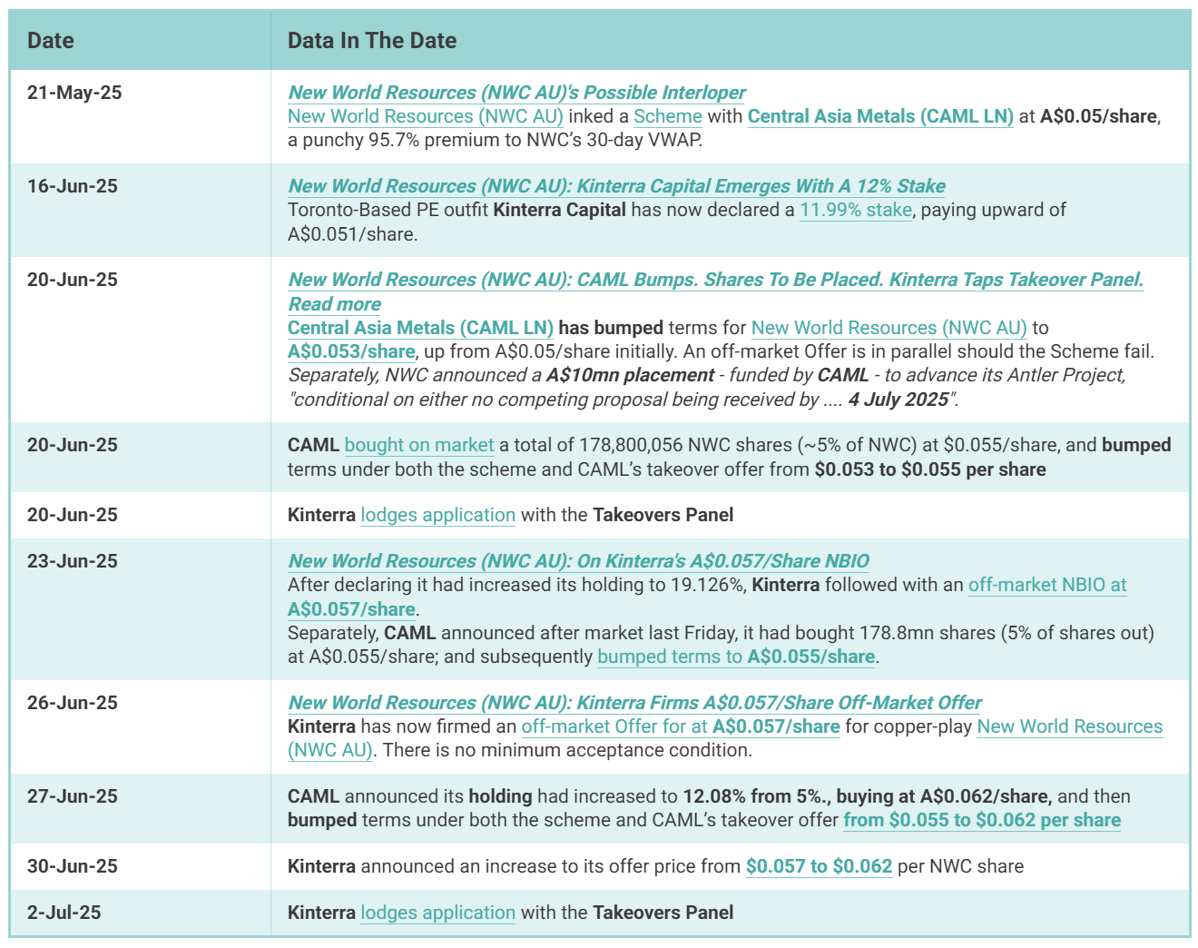 Suitors Central Asia Metals (CAML LN) and Kinterra Capital are locked at A$0.062/share bids apiece for copper play New World Resources (NWC AU).
