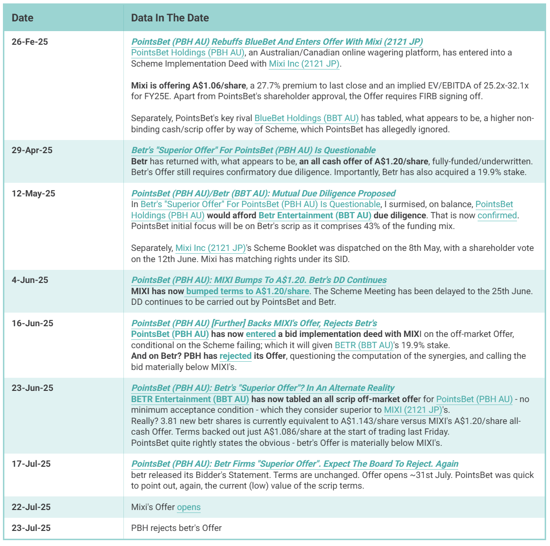 Mixi (2121 JP)'s A$1.20/share cash Offer is now open, with a 50.1% acceptance condition. PointsBet Holdings (PBH AU) is supportive. Mixi currently holds 25.15%. ~16% of shares out have tendered.